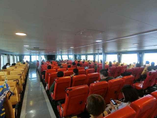 客室内は混雑していて誰かの隣に座らなければ空いていない状態。30分で着くのでデッキで景色を見ながら過ごすことにしました。デッキも混雑していてビックリ!
