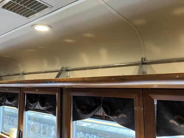 荷物棚があるのはGOOD!観光列車ではデザイン重視で荷物棚がないものがあるので、この点はとても良かったです。特に乗車した駅に戻ってこない観光列車で棚がないのはかなり困るので・・・