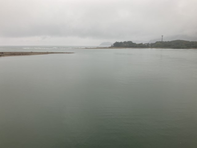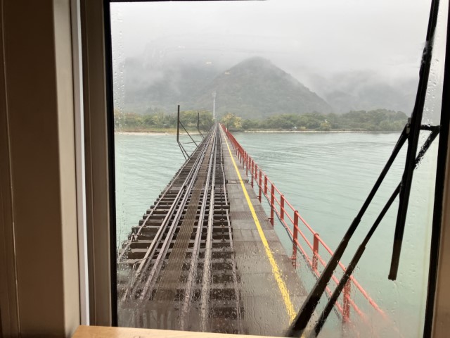 由良川橋梁で徐行。晴れていれば海の上を走っているような爽快な気分になれるのだと思います。この場所、早めに行かないと混雑して写真が撮りにくいかも知れません。