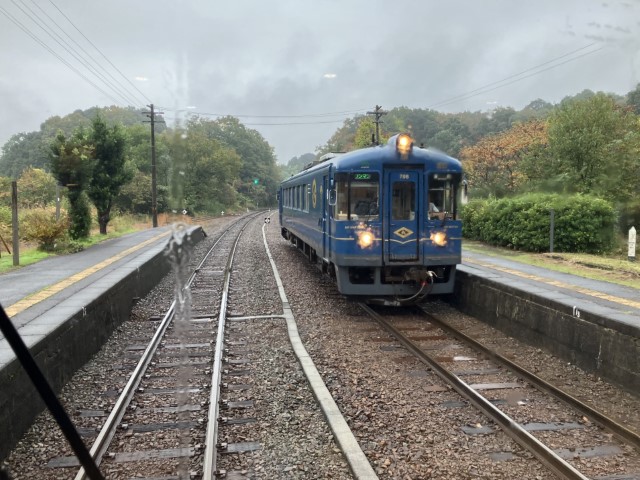四所駅で「丹後あおまつ号」と交換。「あおまつ」は普通列車として運転される観光列車なので乗り得かも?
